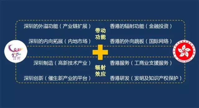 深圳现在处于产业链向外扩展阶段,有较强的外溢效应,需要与香港的金融和现代服务业有机结合。深圳的外溢功能(产业链扩展)+香港的辐射功能(金融投资),深圳的内向拓展(内地市场)+香港的外向跳板(国际网络),可形成带动功能。深圳制造(高新技术产业)+香港服务(工商业支援服务),深圳创新(催生新产业的平台)+香港研发(发明及知识产权保护),可形成辐射效应。这是打造粤港澳大湾区引擎的核心内涵。