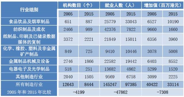 通常认为香港制造业风光不再,那么香港制造业到底怎样呢?与10年前相比,2015年香港本地制造业的机构数目、就业人数和增加值,均呈下降趋势:机构不足万家,就业不足10万人,增加值不到400亿港元。从行业上看,上升幅度大的是食品饮料和烟草制品,下降幅度大的是电器电子光学制品。前者属于传统产业,后者应属于具有一定科技含量的产业。总体而言,香港本地制造业仍以传统产业为主,且呈持续萎缩趋势。