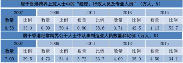 跨界公干中从事制造业的香港人士的数量,近年来也是下降的,从事制造业人员不足5万人,其中“经理、行政人员及专业人员”仅为万余人,这与数量约为3.2万家、雇用员工450万人的珠三角港资制造业并不相称,意味着港资珠三角制造业与香港的关联有所弱化。